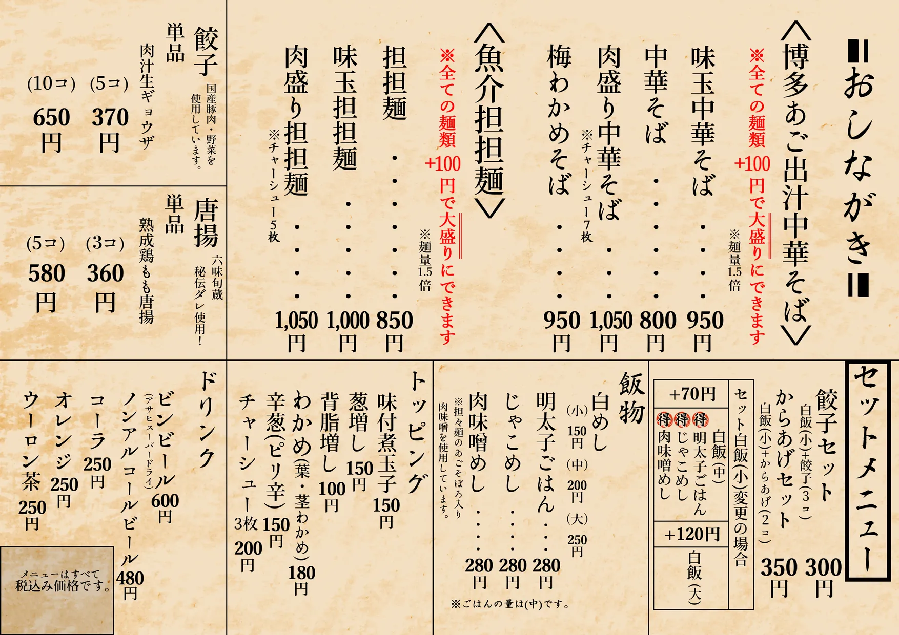 月曜日のお昼に訪問。若干早めに来たので待たずに着席出来ました。スタンダードの中華そばと唐揚げセットを注文。あごダシの効いたスープが美味い!唐揚げも味付けしてあり美味しく、調味料のあご酢をかけたらさっぱり更に美味しくいただけました。 汁なし担々麺もあるようで美味しそうでした。 月曜日のお昼と夜限定の様でした。 -